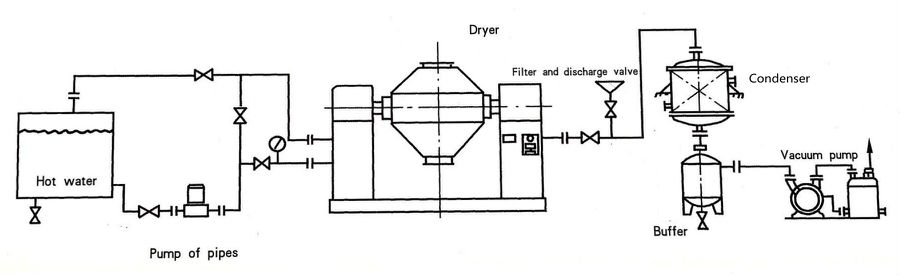Heat source passes through the sealed jacket, and enters into the interlayer of the barrel, which heat the inner wall of the barrel. Raw material is heated and dried in the barrel by transmitting heat with the inner wall. The barrel rotates slowly and the raw material inside is mixed continuously, the purpose of reinforced drying is then realized. During the operation, material is at a vacuum state, the drop of steam pressure makes the moisture at the surface of raw material become saturation and evaporated, and the solvent drops will be taken away by vacuum pump. The inner moisture of raw material will also be infiltrated, evaporated and discharged continuously.